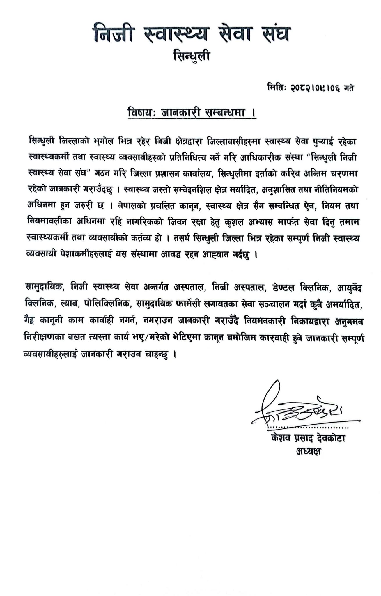 आइतबार संघका अध्यक्ष केशवप्रसाद देवकोटाले जारी गरेको विज्ञप्तिमा सिन्धुली जिल्लाभित्र निजी क्षेत्रमार्फत स्वास्थ्य सेवा प्रदान गर्दै आएका स्वास्थ्यकर्मी तथा व्यवसायीहरूको प्रतिनिधित्व गर्ने उद्देश्यले “सिन्धुली निजी स्वास्थ्य सेवा संघ” गठन गरिएको उल्लेख छ। संघ जिल्ला प्रशासन कार्यालय, सिन्धुलीमा दर्ता प्रक्रियाको अन्तिम चरणमा रहेको जानकारी दिँदै अध्यक्ष देवकोटाले नेपालको प्रचलित कानुन तथा स्वास्थ्य क्षेत्रसँग सम्बन्धित ऐन, नियम र नियमावलीको पूर्ण पालना गरी नागरिकको जीवन रक्षा गर्ने उद्देश्यसहित कुशल अभ्यासमार्फत सेवा दिन सबै स्वास्थ्यकर्मी तथा व्यवसायीहरूलाई आग्रह गरेका छन्।